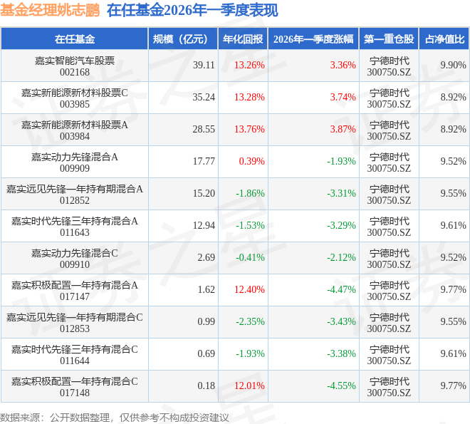 证券之星消息,截止2026年一季度末,基金经理姚志鹏旗下共管理11只基金,本季度表现最佳的为嘉实新能源新材料股票A(003984),季度净值涨3.87%。