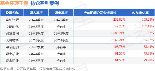 王鹏管理的中信建投中证500增强A基金在20年4季度买入盛和资源,在持有1个季度后在21年1季度卖出。持有期间的估算收益率为109.25%,持有期间盛和资源在2020年到2021年的年报归属净利润增幅达232.82%。