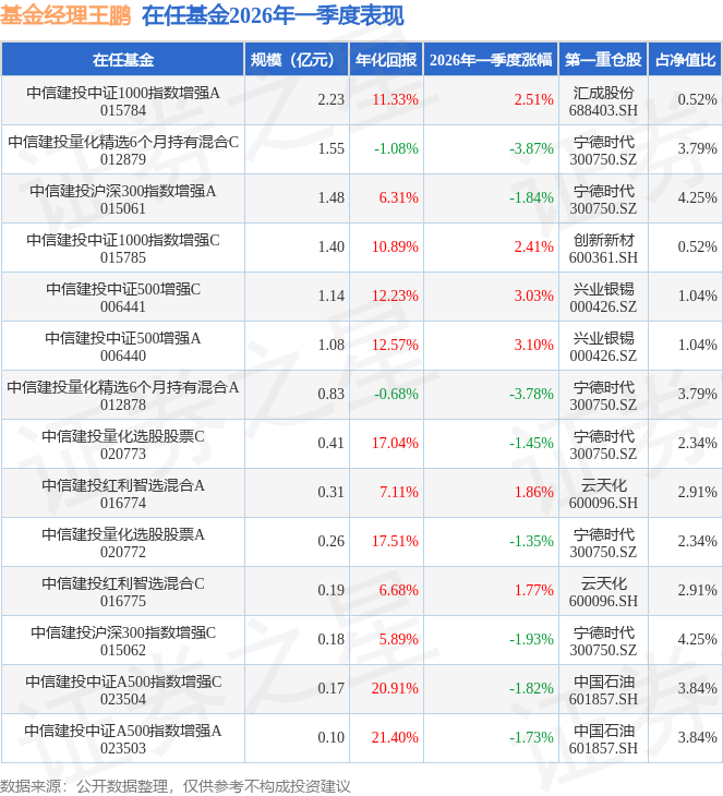 证券之星消息,截止2026年一季度末,基金经理王鹏旗下共管理14只基金,本季度表现最佳的为中信建投中证500增强A(006440),季度净值涨3.1%。