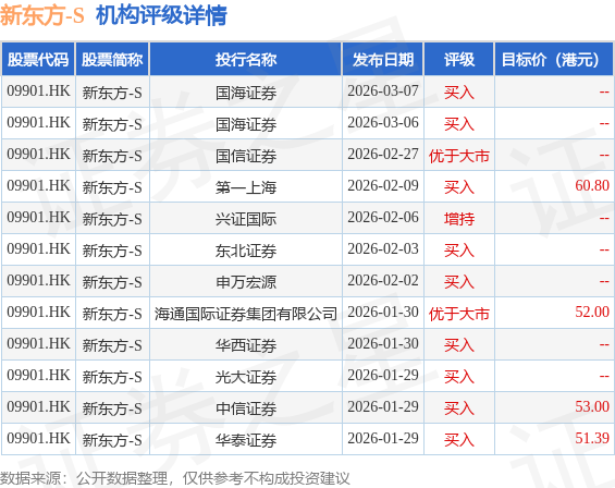 投行对该股的评级以买入为主,近90天内共有9家投行给出买入评级,近90天的目标均价为54.3港元。国海证券最新一份研报给予新东方-S买入评级。