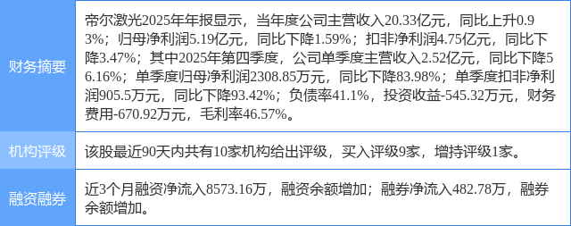 2026年3月31日,国金证券研究员姚遥发布了对帝尔激光的研报《以光伏为基,打造双轮驱动新格局》,该研报对帝尔激光给出“买入”评级。研报中预计公司2026-2028年盈利分别为6.7/7.8/8.9亿元,对应EPS为2.43、2.86、3.25元,当前股价对应PE分别为31/26/23倍,维持“买入”评级。证券之星数据中心根据近三年发布的研报数据计算,该研报作者对此股的盈利预测准确度为68.07%。