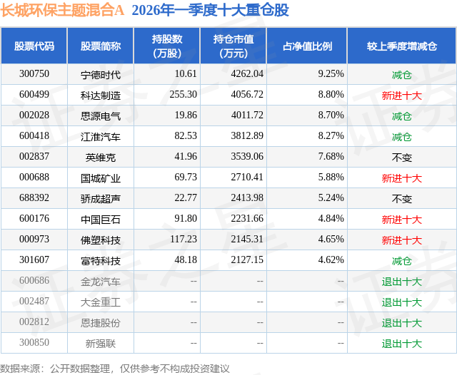 长城环保主题混合A的前十大重仓股如下: