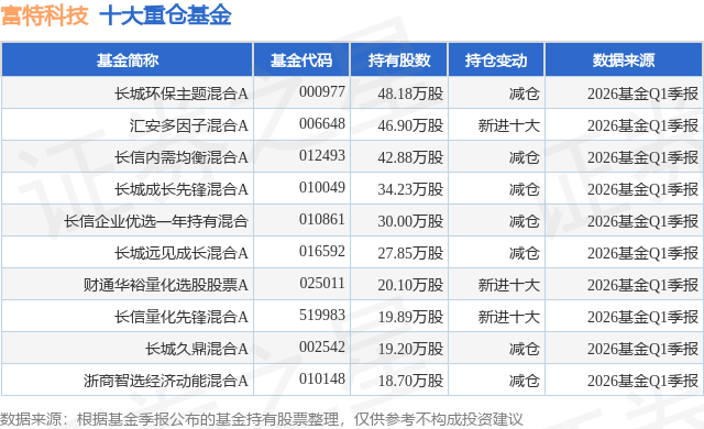 重仓富特科技的前十大公募基金请见下表:
