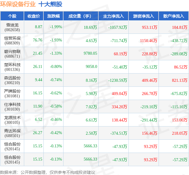 个股表现方面,环保设备行业当日领跌股为雪迪龙(002658),该股当日报收8.87,下跌1.99%,成交量18.69万,主力资金净流出1057.92万元。恒誉环保(688309)以下跌1.93%紧随其后,该股当日成交量4.65万,主力资金净流出711.74万元。除此之外,碧兴物联(688671)、楚环科技(001336)、森远股份(300210)均进入当日熊股之列。具体个股列表见下表: