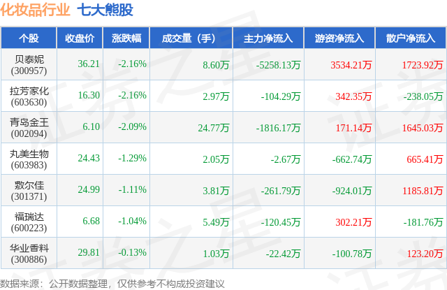 个股表现方面,化妆品行业当日领跌股为贝泰妮(300957),该股当日报收36.21,下跌2.16%,成交量8.6万,主力资金净流出5258.13万元。拉芳家化(603630)以下跌2.16%紧随其后,该股当日成交量2.97万,主力资金净流出104.29万元。除此之外,青岛金王(002094)、丸美生物(603983)、敷尔佳(301371)均进入当日熊股之列。具体个股列表见下表: