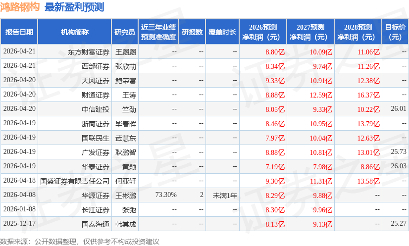 证券之星消息,2026年4月22日鸿路钢构(002541)发布公告称兴业证券李明、长江证券张弛、国盛证券廖文强、财通证券王涛、上海海楚资管朱力超、泓徳基金黄海、中金公司金宾斌、东吴证券黃诗涛、景顺长城基金王平川、乐雪资本陆畅宏 胡中游、西部证券郭好格、华源证券唐心怡、海创私募基金潘云鹤 陆陈伟、华泰证券黄颖、国联民生证券武慧东于2026年4月20日调研我司。