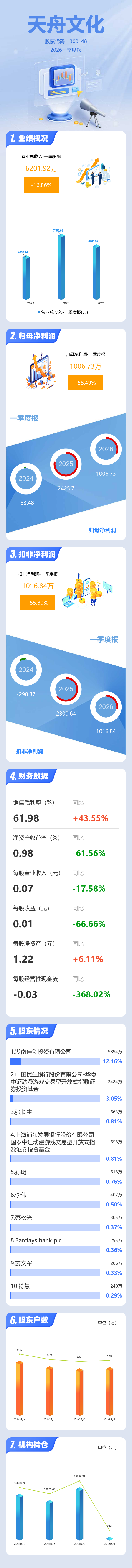证券之星消息,天舟文化2026年一季报显示,一季度公司主营收入6201.92万元,同比下降16.86%;归母净利润1006.73万元,同比下降58.5%;扣非净利润1016.84万元,同比下降55.8%;负债率21.21%,投资收益501.54万元,财务费用114.06万元,毛利率61.98%。