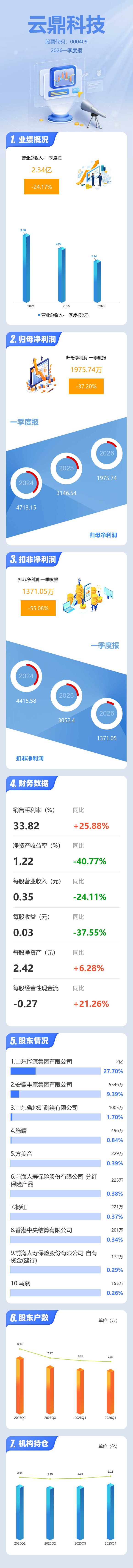 证券之星消息,云鼎科技2026年一季报显示,一季度公司主营收入2.34亿元,同比下降24.18%;归母净利润1975.74万元,同比下降37.21%;扣非净利润1371.05万元,同比下降55.08%;负债率30.71%,财务费用-221.85万元,毛利率33.82%。