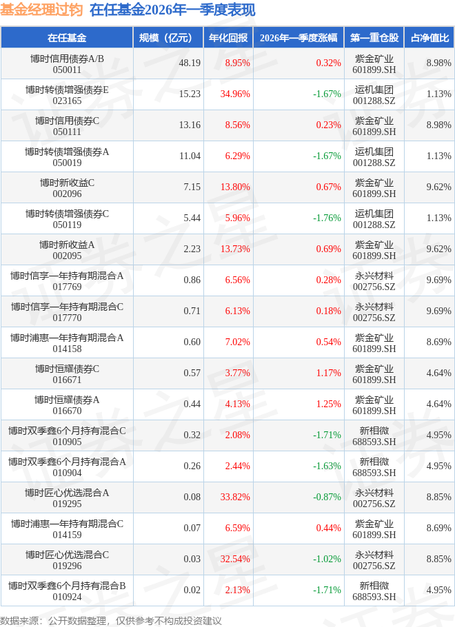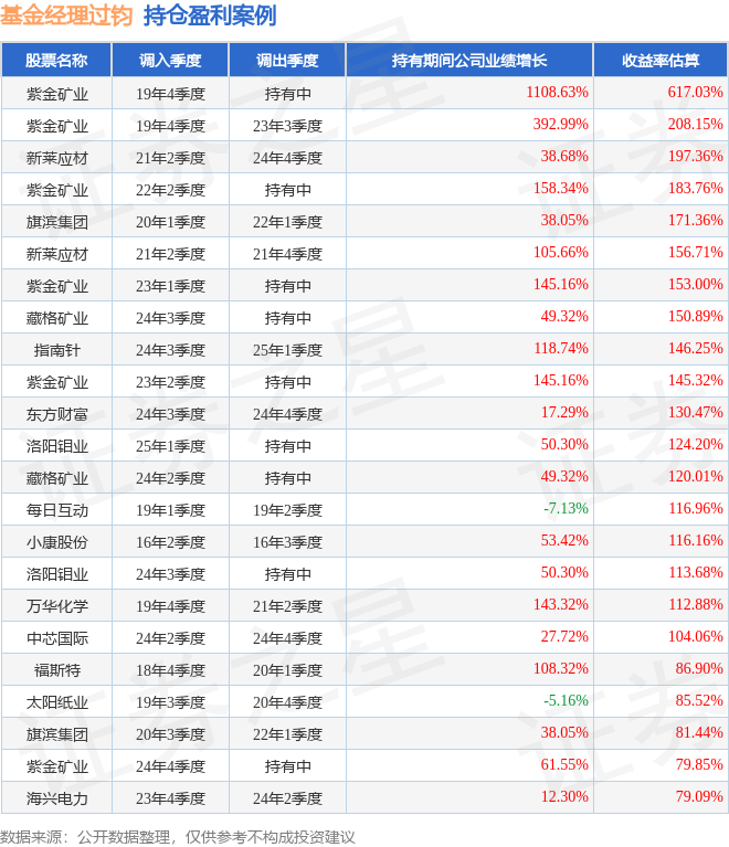 过钧管理的博时新收益A基金在19年4季度买入紫金矿业,已连续持有6年又1个季度。持有期间的估算收益率为617.03%,持有期间紫金矿业在2019年到2025年的年报归属净利润增幅达1108.63%。