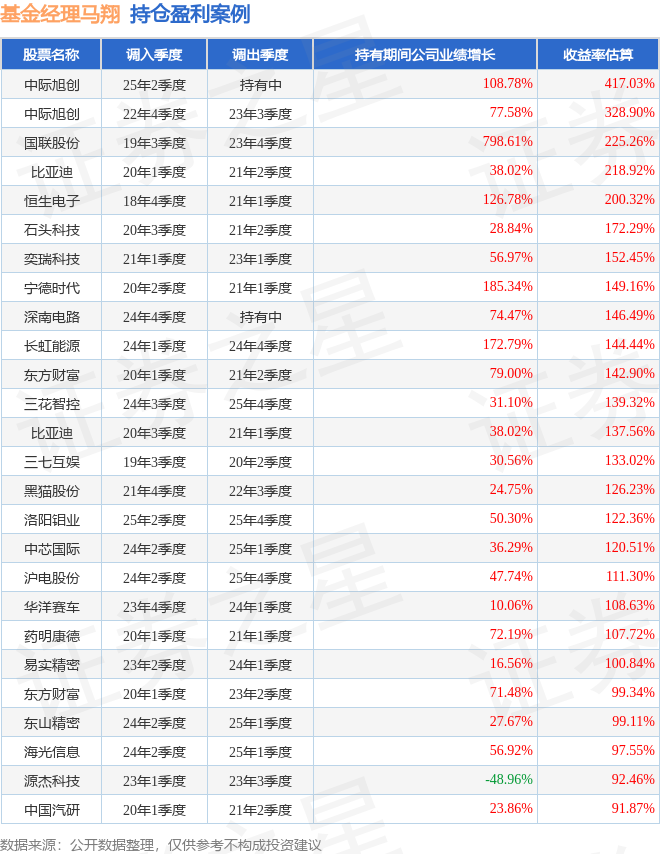 马翔管理的汇添富科技创新混合A基金在25年2季度买入中际旭创,已连续持有3个季度。持有期间的估算收益率为417.03%,持有期间中际旭创在2024年到2025年的年报归属净利润增幅达108.78%。