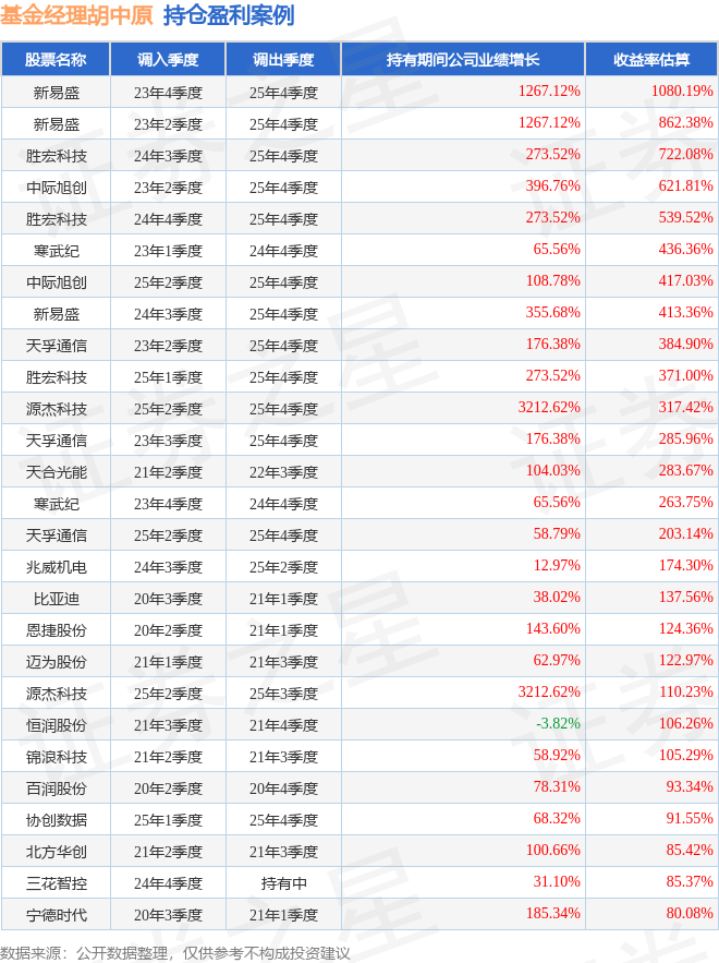 胡中原管理的华商润丰灵活配置混合A基金在23年4季度买入新易盛,在持有2年又0个季度后在25年4季度卖出。持有期间的估算收益率为1080.19%,持有期间新易盛在2023年到2025年的中报归属净利润增幅达1267.12%。