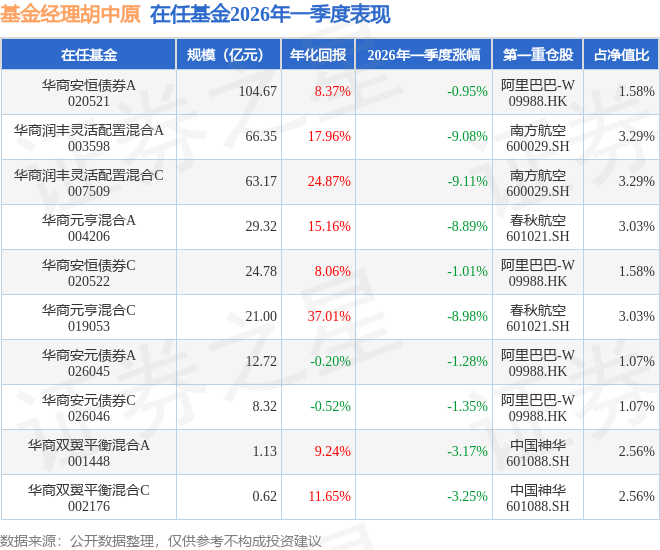 证券之星消息,截止2026年一季度末,基金经理胡中原旗下共管理10只基金,本季度表现最佳的为华商安恒债券A(020521),季度净值跌0.95%。