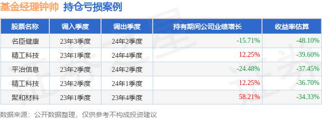 钟帅管理的华夏行业景气混合A基金在23年3季度买入名臣健康,在持有3个季度后在24年2季度卖出。持有期间的估算收益率为-48.1%,持有期间名臣健康在2023年到2024年的年报营业总收入降幅为15.71%。