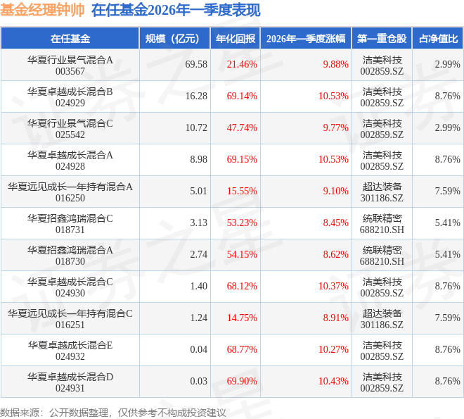 证券之星消息,截止2026年一季度末,基金经理钟帅旗下共管理11只基金,本季度表现最佳的为华夏卓越成长混合B(024929),季度净值涨10.53%。