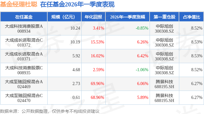 杜聪管理的大成科技消费股票A基金在25年2季度买入源杰科技,在持有2个季度后在25年4季度卖出。持有期间的估算收益率为317.42%,持有期间源杰科技在2024年到2025年的年报归属净利润增幅达3212.62%。