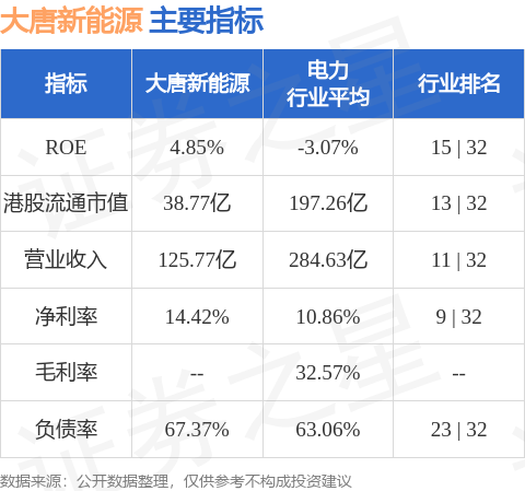 大唐新能源港股市值38.77亿港元,在电力行业中排名第13。主要指标见下表: