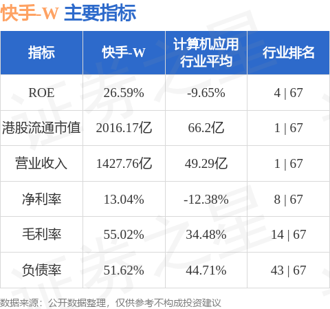 快手-W港股市值2016.17亿港元,在计算机应用行业中排名第1。主要指标见下表: