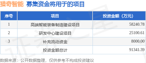 证券之星消息,苏州猎奇智能设备股份有限公司(简称:猎奇智能)拟在深交所创业板上市,募资总金额为9.13亿元,保荐机构为国泰海通证券股份有限公司。募集资金拟用于高端智能装备制造建设项目、研发中心建设项目、补充流动资金,详见下表: