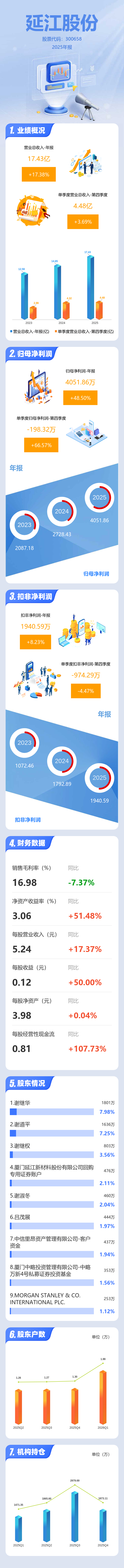 证券之星消息,延江股份2025年年报显示,当年度公司主营收入17.43亿元,同比上升17.38%;归母净利润4051.86万元,同比上升48.5%;扣非净利润1940.59万元,同比上升8.24%;其中2025年第四季度,公司单季度主营收入4.48亿元,同比上升3.69%;单季度归母净利润-198.32万元,同比上升66.57%;单季度扣非净利润-974.29万元,同比下降4.47%;负债率51.68%,投资收益909.74万元,财务费用4457.81万元,毛利率16.98%。