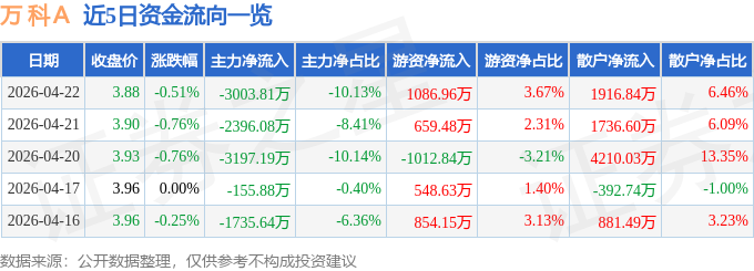 证券之星消息,截至2026年4月22日收盘,万 科A(000002)报收于3.88元,下跌0.51%,换手率0.79%,成交量76.47万手,成交额2.97亿元。