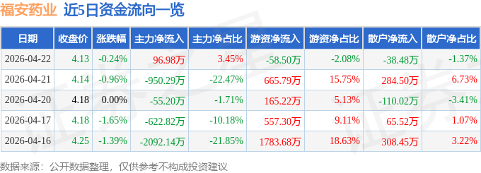 证券之星消息,截至2026年4月22日收盘,福安药业(300194)报收于4.13元,下跌0.24%,换手率0.71%,成交量6.83万手,成交额2812.16万元。