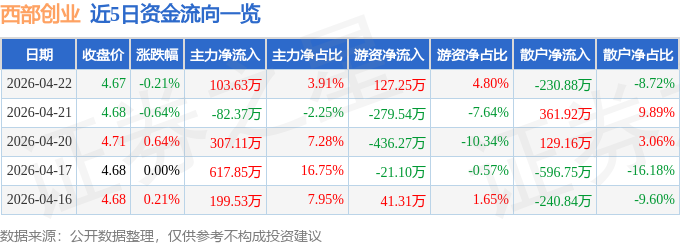 证券之星消息,截至2026年4月22日收盘,西部创业(000557)报收于4.67元,下跌0.21%,换手率0.39%,成交量5.68万手,成交额2648.43万元。