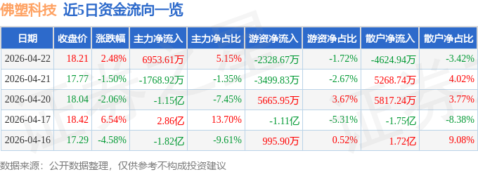证券之星消息,截至2026年4月22日收盘,佛塑科技(000973)报收于18.21元,上涨2.48%,换手率7.75%,成交量74.97万手,成交额13.51亿元。