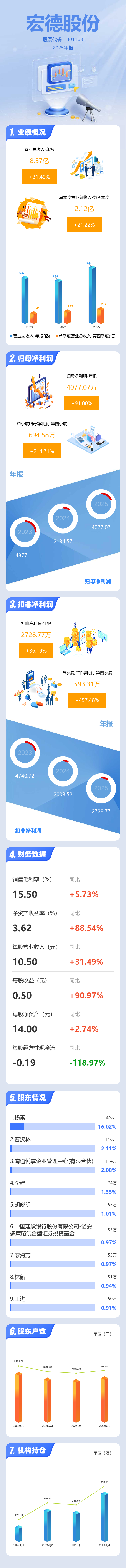 证券之星消息,宏德股份2025年年报显示,当年度公司主营收入8.57亿元,同比上升31.49%;归母净利润4077.07万元,同比上升91.0%;扣非净利润2728.77万元,同比上升36.2%;其中2025年第四季度,公司单季度主营收入2.12亿元,同比上升21.22%;单季度归母净利润694.58万元,同比上升214.71%;单季度扣非净利润593.31万元,同比上升457.48%;负债率26.6%,投资收益192.46万元,财务费用-78.8万元,毛利率15.5%。