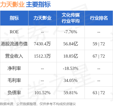 力天影业港股市值7430.4万港元,在文化传媒行业中排名第59。主要指标见下表:
