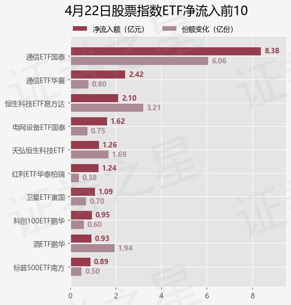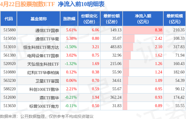 当日有152只股票指数ETF基金出现资金净流入,其中净流入排首位的是通信ETF国泰(515880),份额增加了6.06亿份,净流入额为8.38亿元。