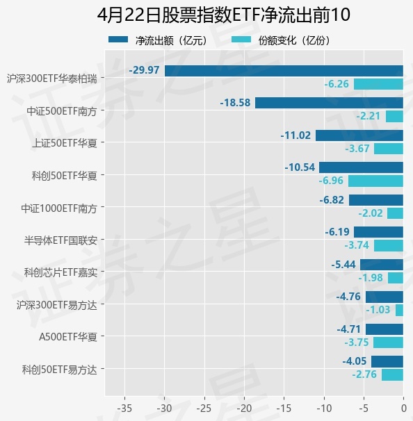 当日有249只股票指数ETF基金出现资金净流出,其中净流出排首位的是沪深300ETF华泰柏瑞(510300),份额减少了6.25亿份,净流出额为29.97亿元。