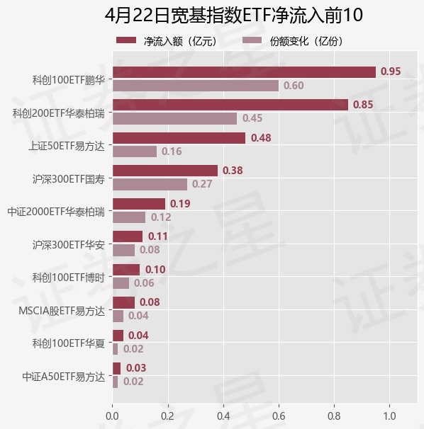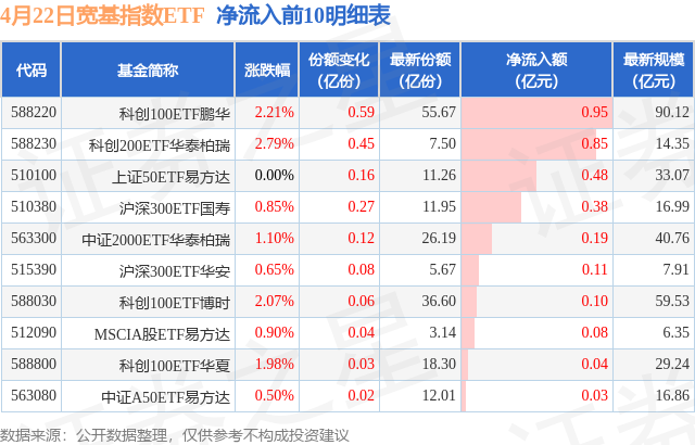 当日有12只宽基指数ETF基金出现资金净流入,其中净流入排首位的是科创100ETF鹏华(588220),份额增加了5950.0万份,净流入额为9548.33万元。