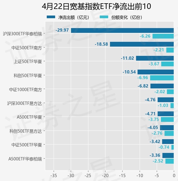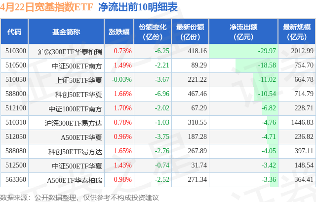 当日有78只宽基指数ETF基金出现资金净流出,其中净流出排首位的是沪深300ETF华泰柏瑞(510300),份额减少了6.25亿份,净流出额为29.97亿元。