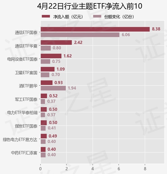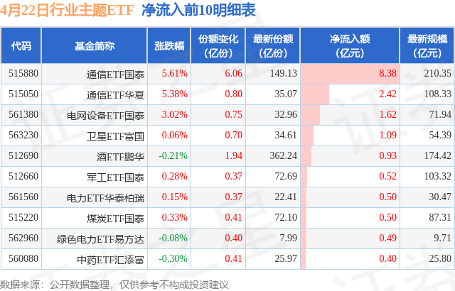 当日有87只行业主题ETF基金出现资金净流入,其中净流入排首位的是通信ETF国泰(515880),份额增加了6.06亿份,净流入额为8.38亿元。