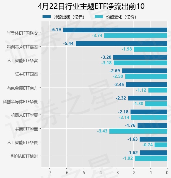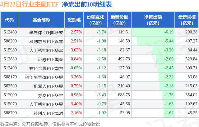 当日有146只行业主题ETF基金出现资金净流出,其中净流出排首位的是半导体ETF国联安(512480),份额减少了3.74亿份,净流出额为6.19亿元。
