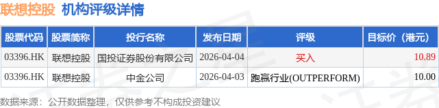 投行对该股的评级以跑赢行业(OUTPERFORM)为主,近90天内共有1家投行给出跑赢行业(OUTPERFORM)评级,近90天的目标均价为10.44港元。国投证券股份有限公司最新一份研报给予联想控股买入评级,目标价10.89港元。