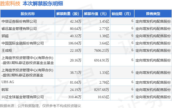 证券之星消息,根据市场公开信息整理,胜宏科技(300476)于4月23日将有766.07万股限售股份解禁,为公司定向增发机构配售股份,占公司总股本0.79%。(本次数据根据历史公告整理得出,实际情况以上市公司最新公告为准)本次解禁后,公司还有736.24万股限售股份,占总股本0.76%。具体如下图所示: