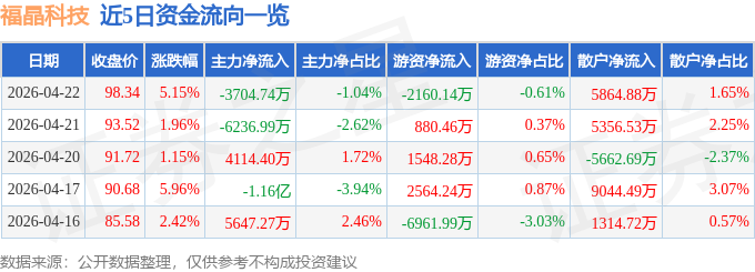 证券之星消息,截至2026年4月22日收盘,福晶科技(002222)报收于98.34元,上涨5.15%,换手率7.75%,成交量36.28万手,成交额35.46亿元。