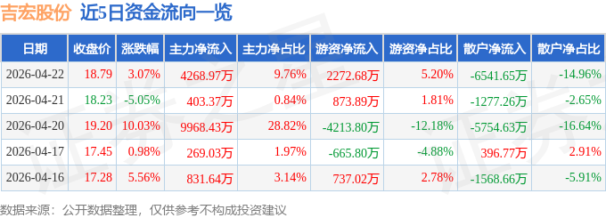证券之星消息,截至2026年4月22日收盘,吉宏股份(002803)报收于18.79元,上涨3.07%,换手率8.12%,成交量23.44万手,成交额4.37亿元。