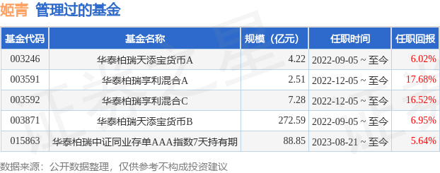 姬青女士:中国国籍,北京大学企业管理专业硕士。曾任海通证券股份有限公司管理培训生。2017年9月加入华泰柏瑞基金管理有限公司,历任交易部交易员、固定收益部基金经理助理。2022年9月起任华泰柏瑞天添宝货币市场基金的基金经理。2022年12月5日起担任华泰柏瑞享利灵活配置混合型证券投资基金基金经理。2023年08月21日起任华泰柏瑞中证同业存单AAA指数7天持有期证券投资基金基金经理。