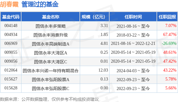 胡春霞女士:武汉大学金融学硕士,现任圆信永丰基金管理有限公司权益投资部总监。历任港澳证券投资咨询部分析师,中原证券研究所研究员,海通证券研究所研究员,国泰君安证券研究所研究员,圆信永丰基金管理有限公司权益投资部副总监。胡春霞女士于2018年3月22日起管理圆信永丰消费升级灵活配置混合型证券投资基金,于2020年5月14日至2021年5月19日管理圆信永丰大湾区主题混合型证券投资基金,于2021年8月16日起管理圆信永丰多策略精选混合型证券投资基金,于2021年8月16日至2022年12月21日管理圆信永丰高端制造混合型证券投资基金,于2022年9月23日起管理圆信永丰弘阳股票型证券投资基金。2024年4月3日担任圆信永丰兴诺一年持有期灵活配置混合型证券投资基金基金经理。
