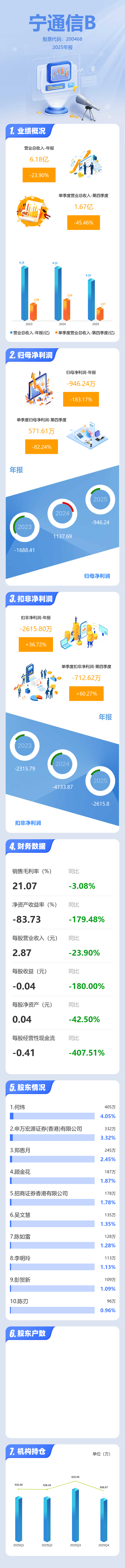 证券之星消息,宁通信B2025年年报显示,当年度公司主营收入6.18亿元,同比下降23.91%;归母净利润-946.24万元,同比下降183.17%;扣非净利润-2615.8万元,同比上升36.72%;其中2025年第四季度,公司单季度主营收入1.67亿元,同比下降45.47%;单季度归母净利润571.61万元,同比下降82.25%;单季度扣非净利润-712.62万元,同比上升60.27%;负债率88.0%,投资收益803.81万元,财务费用859.76万元,毛利率21.07%。