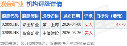 投行对该股的评级以买入为主,近90天内共有2家投行给出买入评级,近90天的目标均价为47.7港元。第一上海最新一份研报给予紫金矿业买入评级,目标价47.7港元。