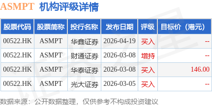 投行对该股的评级以买入为主,近90天内共有3家投行给出买入评级,近90天的目标均价为146港元。华鑫证券最新一份研报给予ASMPT买入评级。