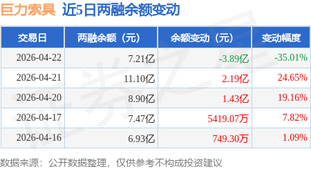 证券之星消息,4月22日,巨力索具(002342)融资买入3.69亿元,融资偿还7.57亿元,融资净卖出3.89亿元,融资余额7.2亿元,近20个交易日中有12个交易日出现融资净买入。