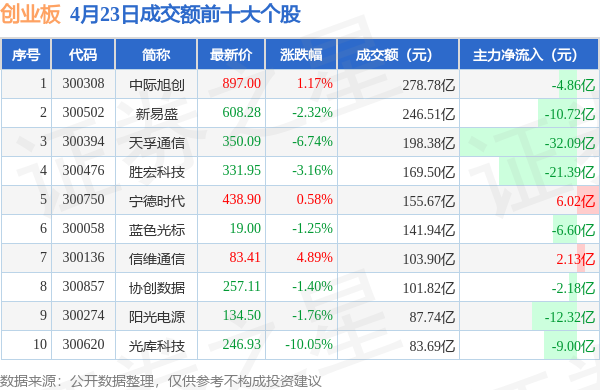 当日创业板成交额前10大个股中3只个股收涨,平均涨幅2.21%,其中中际旭创(300308)以成交额278.78亿元排第一。从主力资金流入看,成交额前10大个股中有2只个股呈现主力资金净流入。