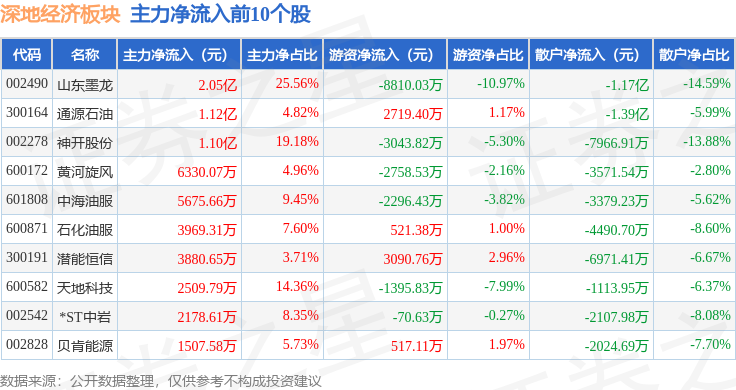 从资金流向上来看,当日深地经济板块主力资金净流入5.18亿元,游资资金净流出9971.44万元,散户资金净流出4.18亿元。深地经济板块个股资金流向见下表: