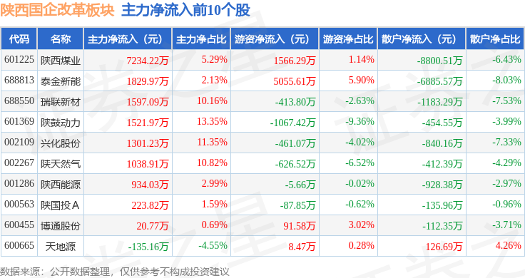 从资金流向上来看,当日陕西国企改革板块主力资金净流出6.48亿元,游资资金净流入1.49亿元,散户资金净流入4.99亿元。陕西国企改革板块个股资金流向见下表: