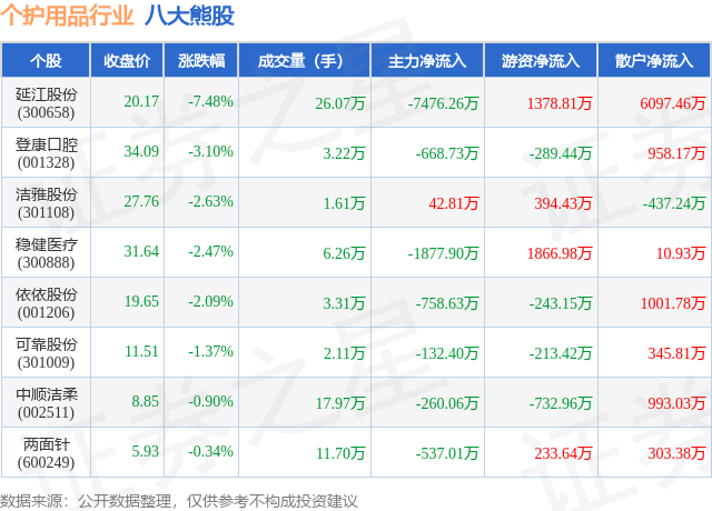 个股表现方面,个护用品行业当日领跌股为延江股份(300658),该股当日报收20.17,下跌7.48%,成交量26.07万,主力资金净流出7476.26万元。登康口腔(001328)以下跌3.1%紧随其后,该股当日成交量3.22万,主力资金净流出668.73万元。除此之外,洁雅股份(301108)、稳健医疗(300888)、依依股份(001206)均进入当日熊股之列。具体个股列表见下表: