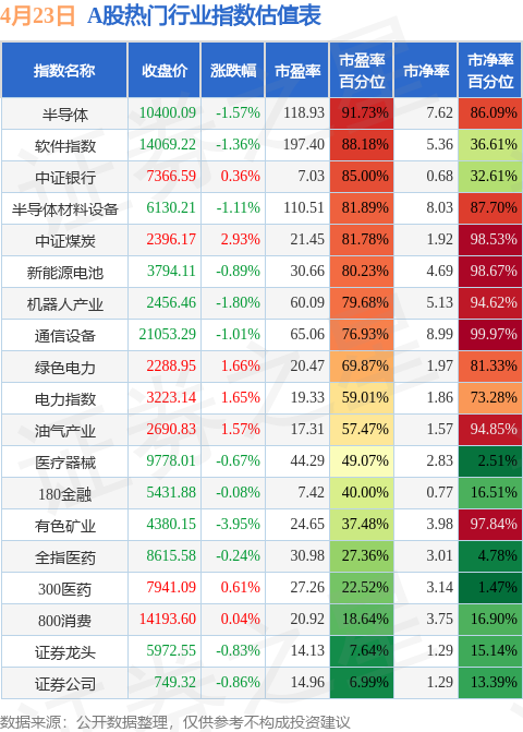 热门行业指数方面,半导体的市盈率百分位较高,为91.73%。而证券公司的市盈率百分位较低,为6.99%。